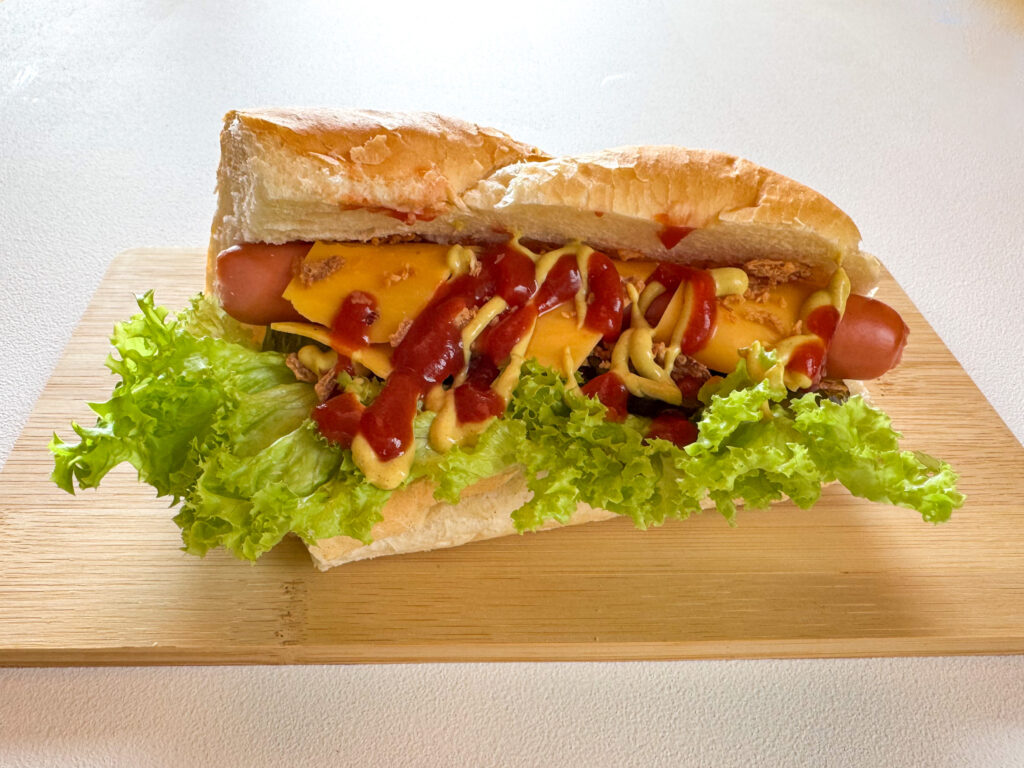 | Kifli, saláta, virsli, sajt, csemegeuborka, pirított hagyma, ketchup, mustár, majonéz |