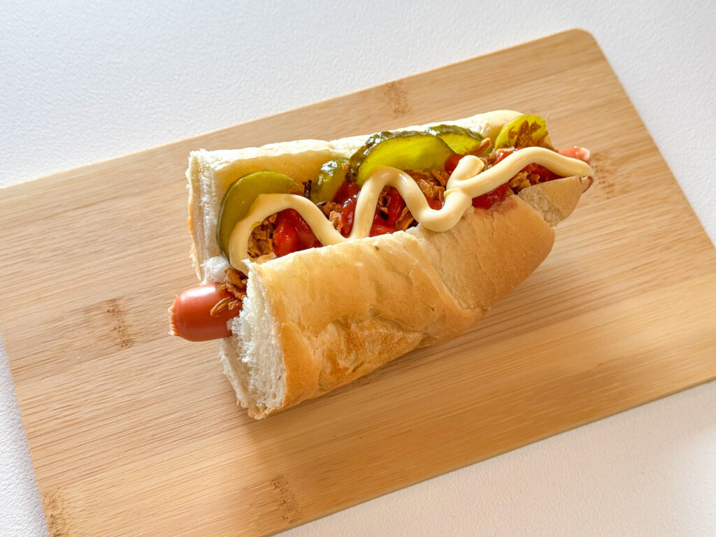 | Kifli, virsli, csemegeuborka, pirított hagyma, ketchup, mustár, majonéz |